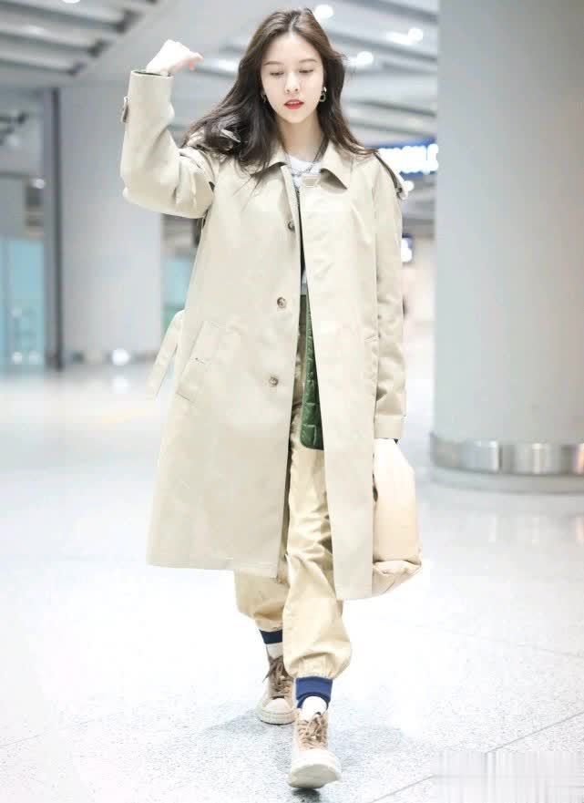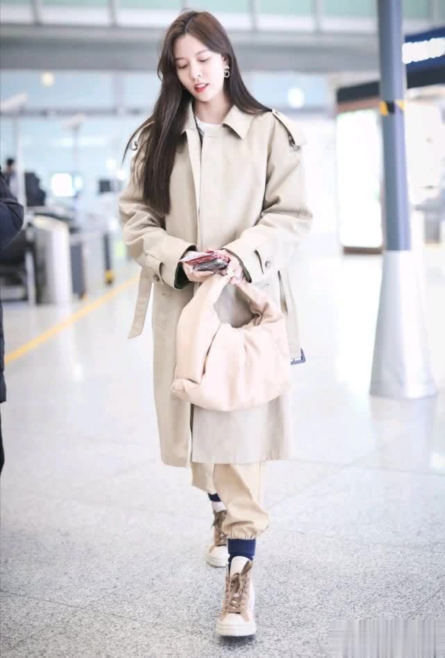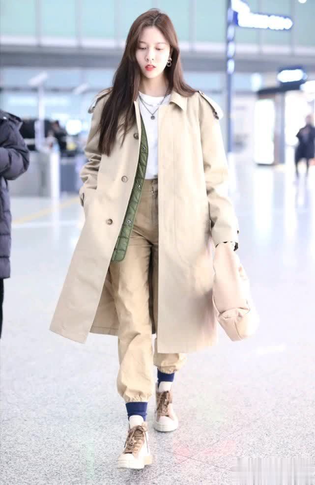 如果你也是高个子的女生的话,可以尝试这种长款的风衣,不管是搭配牛仔裤还是工装裤,都很好看。宋妍霏的这一条浅咖色的工装裤,是束脚裤的版型,很考验腿型,如果是短腿或者是粗腿的女生可能就驾驭不了。而她的身材比较高挑,所以穿出了不一样的效果。