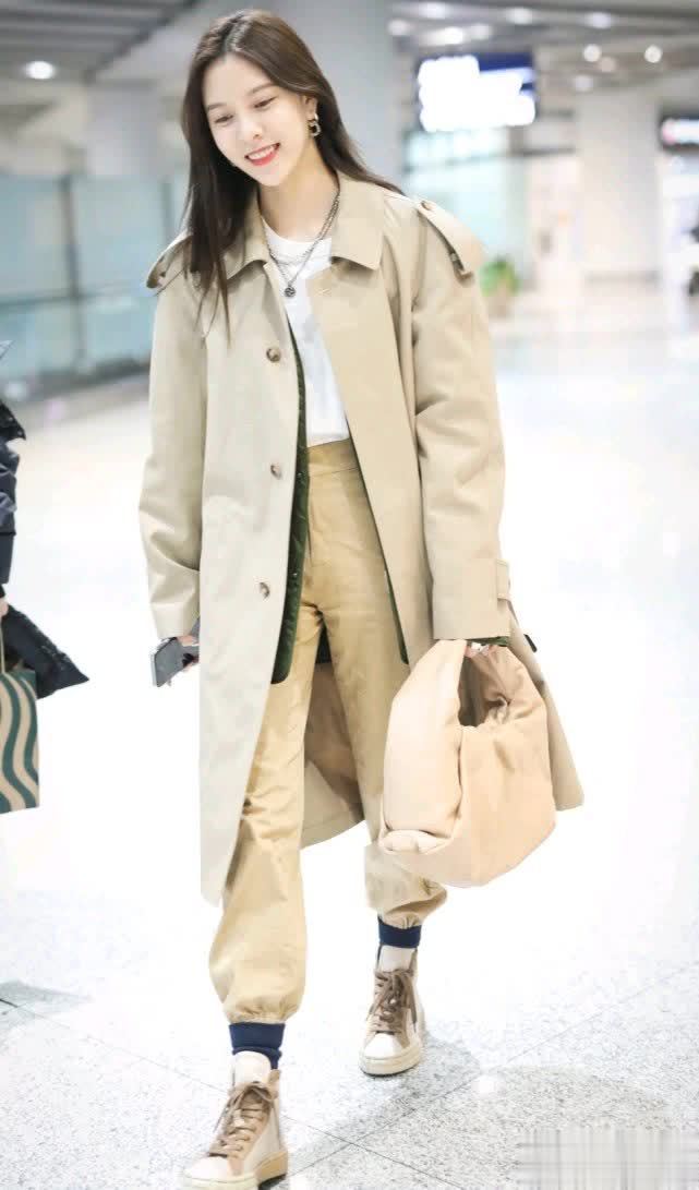 她将白色的内搭塞进裤子里面,这样就可以提升腰线,起到显高的效果。如果外套是短款的话,可能看上去身材比例会更修长吧,但她选择长款的风衣,穿出了不一样的感觉。关键还是身材比例好,换做一般人这样搭配可能会显得又矮又胖吧?大家觉得宋妍霏这一身机场私服怎么样呢?